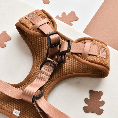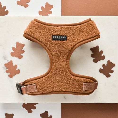 Discover the charming Cocopup London Teddy Paddington Adjustable Neck Harness, designed specifically for small dogs. This piece features a super cosy, textured teddy fabric perfect for cooler weather walks. It integrates seasonal style seamlessly with practical canine wear.