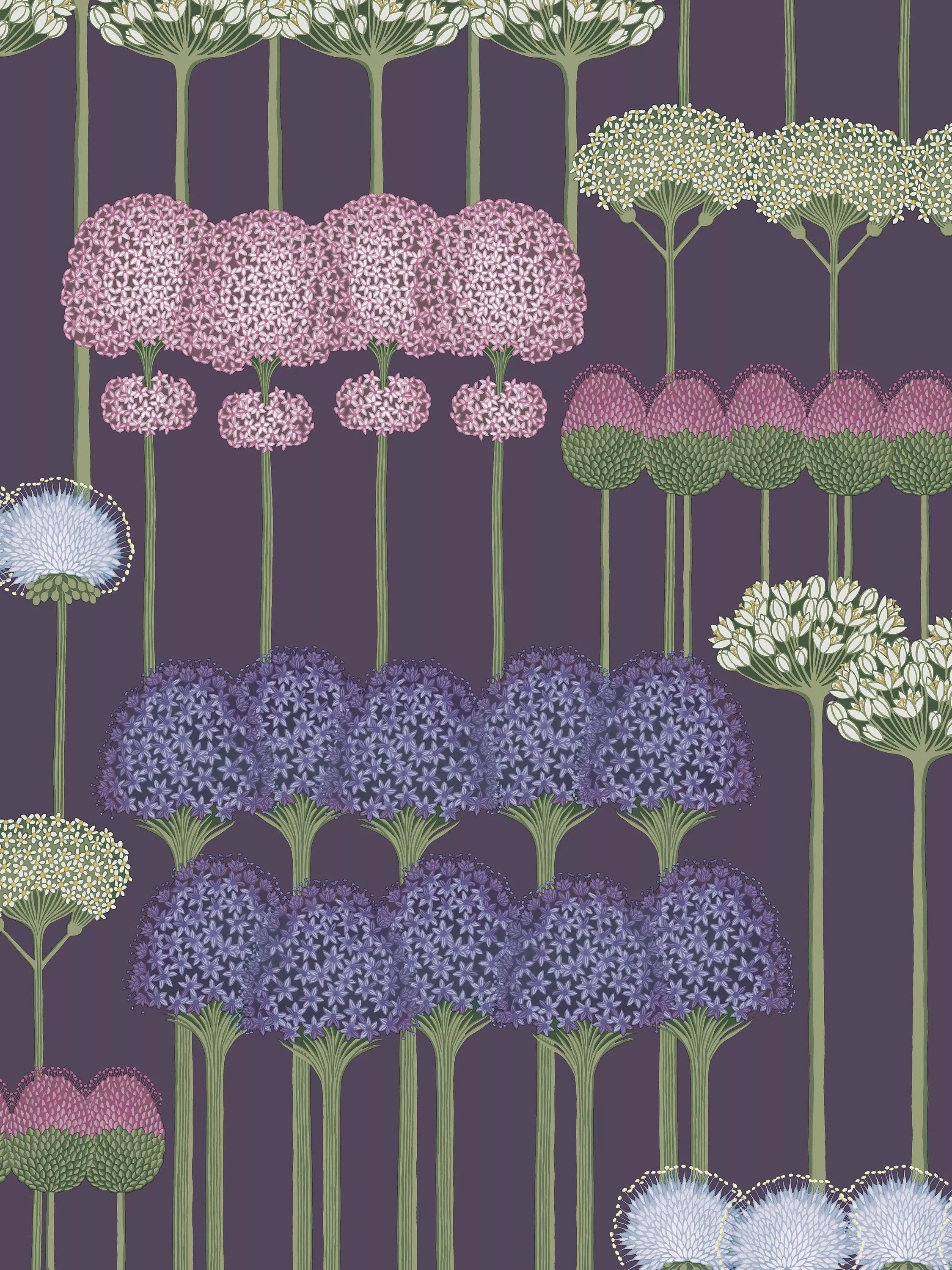 A contemporary, geometric take on the traditional floral motif, Allium takes the striking herbaceous perennial and creates a bold repeat of blooming clusters. With their firework burst of colour and texture, the allium spheres of flora, combined with their long, leafless stems, makes a unique floral stripe.