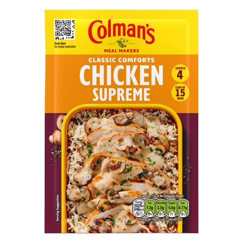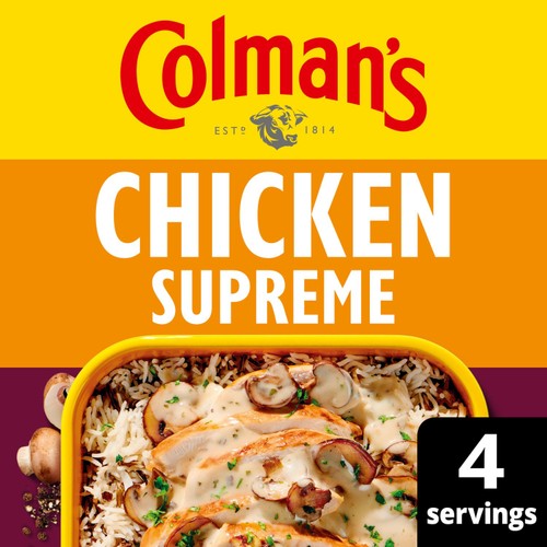 Quickly create a Classic Comfort food that will satisfy the whole family using Colman's Chicken Supreme Meal Maker, which delivers a full-on flavour experience, Chicken Supreme sauce mix with a delicious blend of mushrooms, parsley and nutmeg that lets you enjoy a rich, warming classic dish in just a few easy steps, Enjoy our Chicken Supreme Meal Maker in an easy-to-use, recyclable paper pack, This Chicken Supreme Meal Maker contains no artificial colours or preservatives, Turn every meal into a homely feast with Colman's Chicken Supreme Meal Maker!, This Colman's Chicken Supreme Meal Maker provides 4 servings so you always have a delicious meal at hand