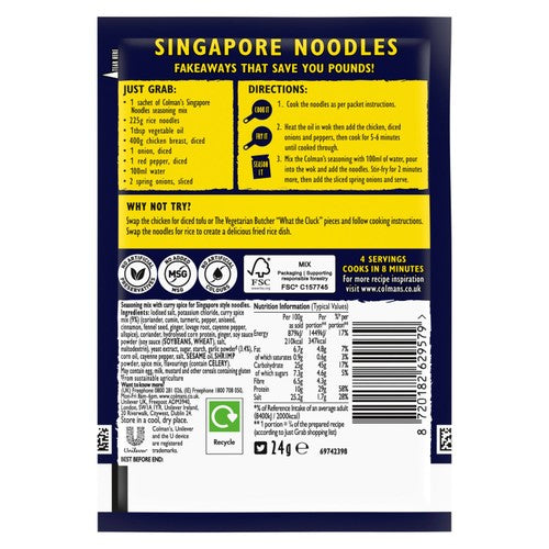 Whip up your own full-on-flavour version of your favourite takeaway with Colman's Weekend Wonders Singapore Noodles Meal Maker recipe mix, An aromatic seasoning mix of curry spices that lets you enjoy delicious Singapore-style noodles within minutes, Our Singapore Noodles Meal Maker recipe mix contains no artificial colours or preservatives and comes in an easy-to-use, recyclable paper pack, With this spice mix, you can create a tasty Singapore-inspired dish in just three simple steps, Like mixing it up? Combine our seasoning mix with rice to make delicious fried rice, This Colman's meal maker provides 4 servings so you always have a delicious family meal at hand