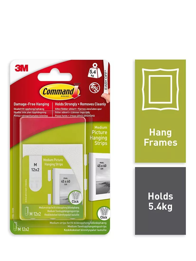 Pack contents: 4 sets of medium strips for three pictures up to 45 x 60cm and up to 5.4kg in weight.