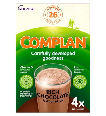 Complan Chocolate Nutritional Drink sachets offer a fortified boost when consumed alongside your regular diet. This convenient supplement is formulated to support general health and wellbeing through essential nutrients. Each serving provides a measured intake of vitamins and minerals crucial for daily bodily functions.