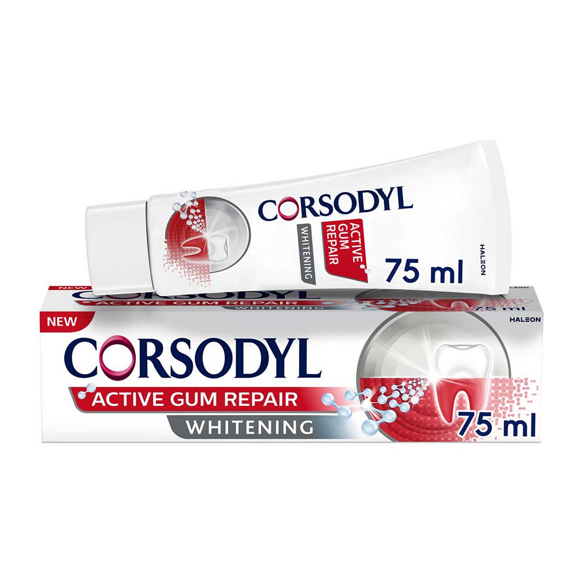 Corsodyl Active Gum Repair Whitening Toothpaste helps reverse gum problems by targeting plaque, the main cause of early gum disease. Designed by gum experts, it is clinically proven to actively remove plaque bacteria, to help repair inflamed, swollen & bleeding gums. It's flavour enhancing technology with a blend of purposefully selected flavour ingredients helps to balance the overall taste; combined with specific cooling materials for a fresh experience. Plus, it gently lifts stains to whiten teeth.