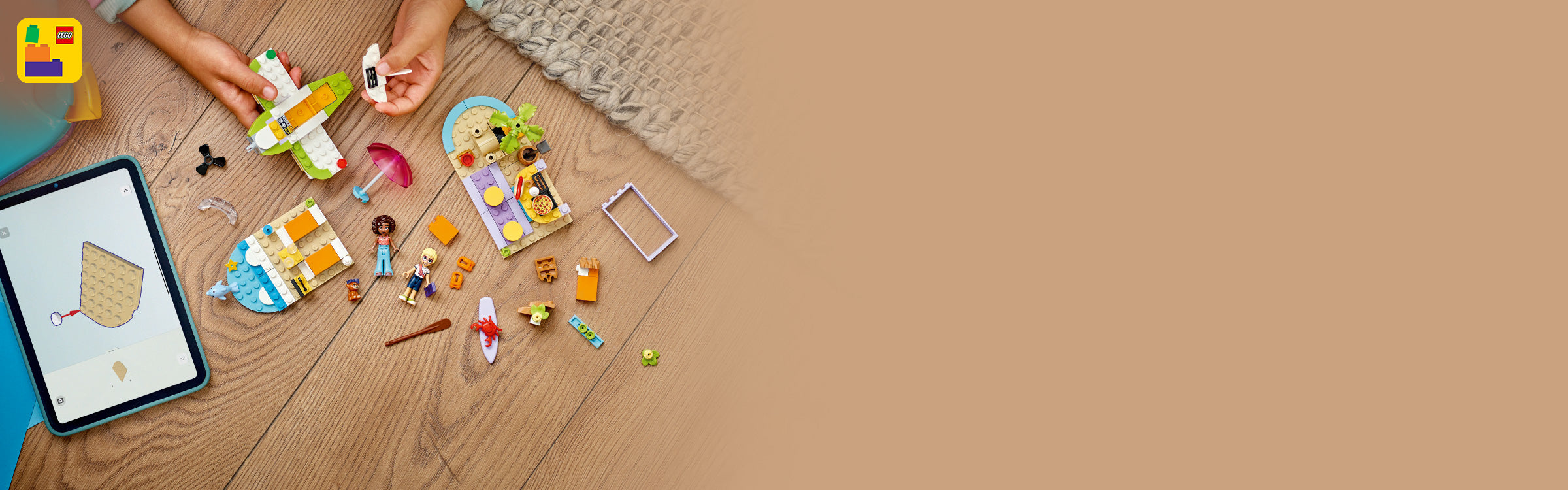 This pretend-play set has everything kids need to build a seaplane toy with spinning propeller, a relaxation area with a surfboard, and a beach café hangout with sandcastles, seating and ice cream accessories. The models rebuild into a speedboat toy, an outside seating area and a pizza shop with a pizza oven. The building toy comes with 2 minidolls and dog and dolphin figures for role play.