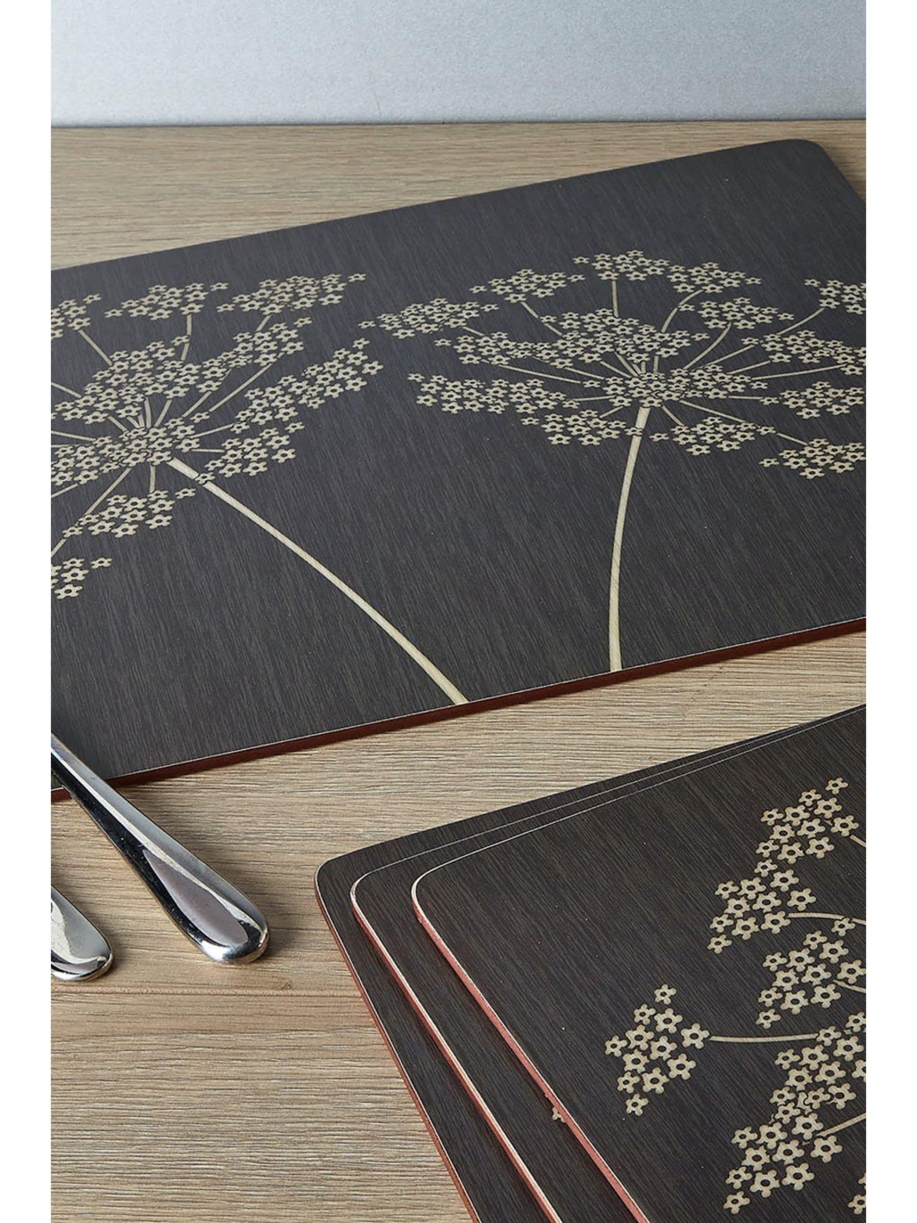 •Includes 4 x large rectangular placemats – ideal for family dining. •Decorative and functional, with a minimalistic print of delicate blooming flowers. •Cork backing improves grips and helps avoid messy spills. •Easy to clean – just wipe the stain-resistant lacquer layer. •Robust enough for any occasion, these heat-resistant cork-backed placemats come with a 5-year guarantee. Invite some minimalistic style to your table with these attractive table mats, decorated with elegant bursts of delicate flowers. You get four in the set, each featuring an anti-slip cork backing and a lacquer finish to protect the design. Use them for daily dining or dinner parties – they re robust enough for any occasion and wipe clean easily to use again and again. Heat resistant to 120°C. Each measures 40 x 29cm