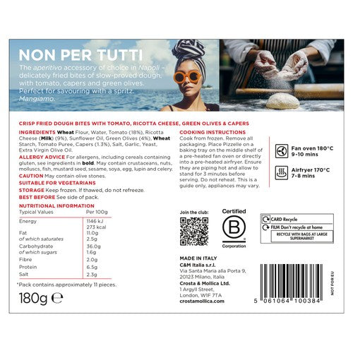 These Crosta Mollica dough bites offer an authentic Italian taste profile ideal for simple entertaining. Each piece begins as slow-proved dough, achieving a satisfying crispness when fried. They are generously filled with fresh ricotta cheese combined with sharp tomato, capers, and pungent green olives.