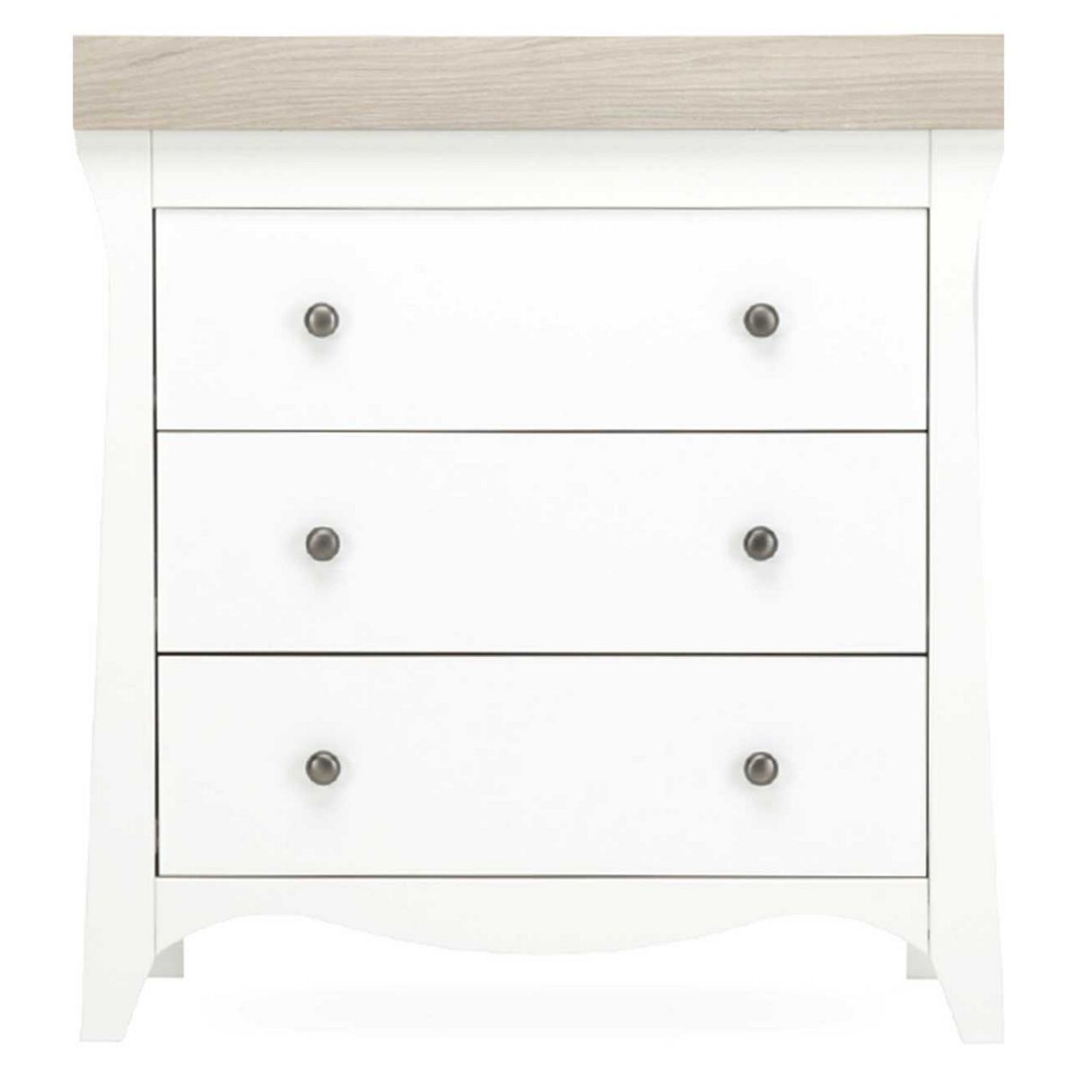 Complete your fairy tale with the Clara furniture set. Classic curvature with a modern contemporary look, function and style to transform any nursery. Clara 3 drawer dresser designed to offer you style, storage and function. 3 spacious drawers, removable changing station, featuring classic driftwood ash detailing. Designed to care, designed to last.