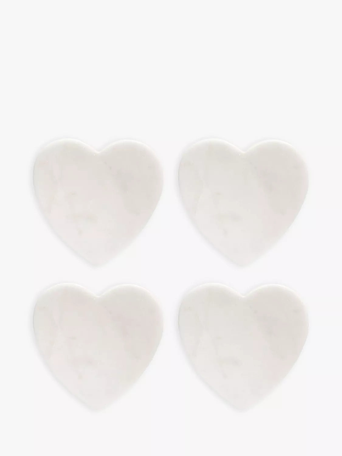 Four heart-shaped marble coasters from Culinary Concepts. The coasters showcase natural marble variations, making each one slightly different.