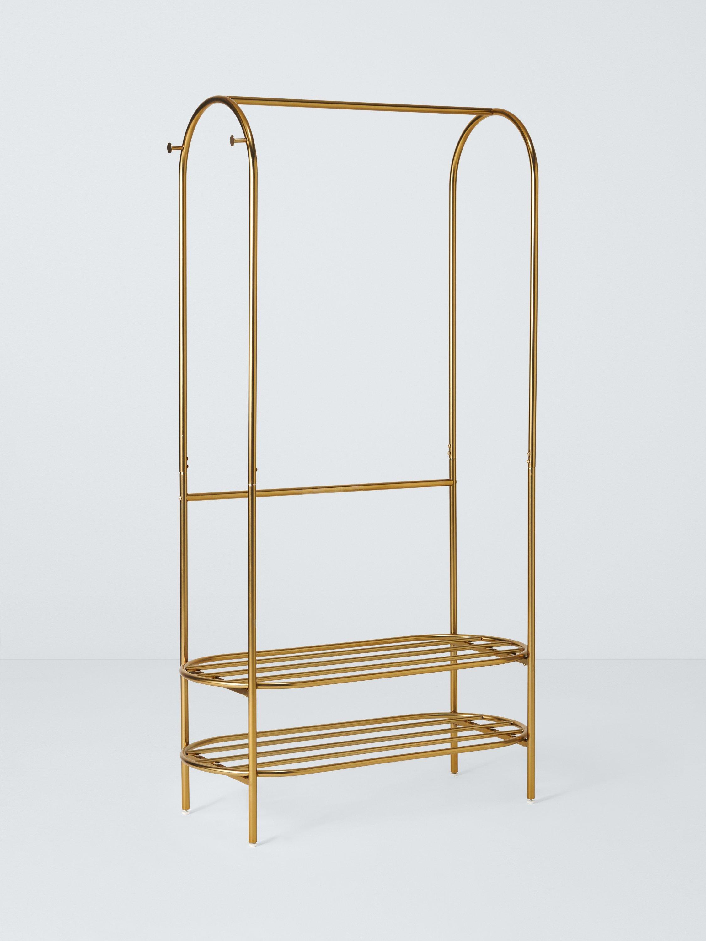 This John Lewis decorative gold metal clothes rail elegantly elevates your guest room storage instantly. Its striking, curvy silhouette features a dedicated rack below for footwear storage, alongside handy side knobs for accessories like scarves or bags. This visually appealing unit provides practical, accessible hanging capacity for garments and essential items every single day.