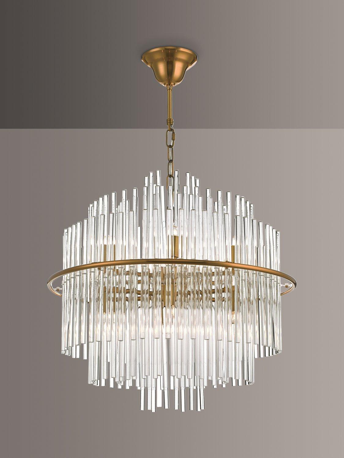 A dazzling, Art-Deco-inspired ceiling light formed from glass rods in a tiered formation. It's supported by a metal ceiling rose and band and it's height-adjustable for perfect positioning in your space. The perfect light for creating a wow-factor.