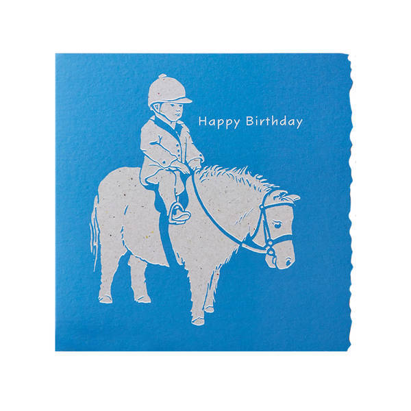 This greetings card features a charming pony theme set against a textured, natural fleck background, offering a contemporary visual feel. It includes unique die-cut edging and solid colour blocking for added visual appeal. The inside of this specific pony greeting card is left completely blank, allowing space for your fullest personalised message.