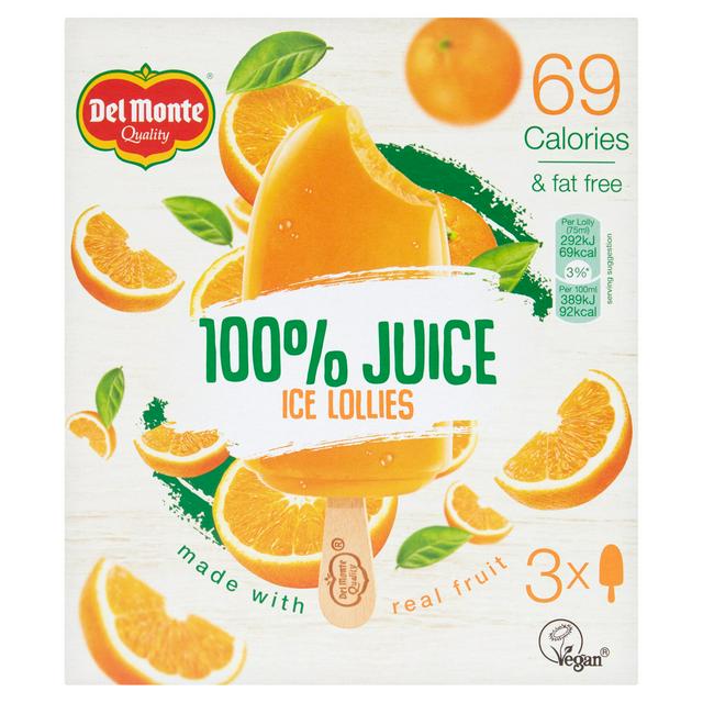 Del Monte Orange Lollies provide a bright, chilled refreshment made using concentrated fruit juices, including orange, grape, and apple. These frozen treats contain only 69 calories per serving and are officially fat-free, offering a lighter indulgence option for warm weather. They are certified suitable for both vegans and vegetarians by The Vegan Society.