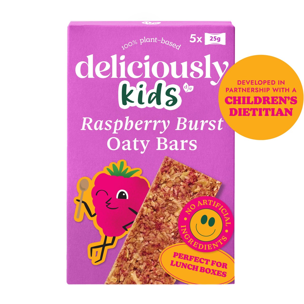 Enjoy these Deliciously Kids Raspberry Burst Oaty Bars, which are delightfully baked for a soft texture. They are carefully made using 100% wholegrain oats, providing a wholesome base for little ones. The bars feature a genuine raspberry flavour that appeals to children.