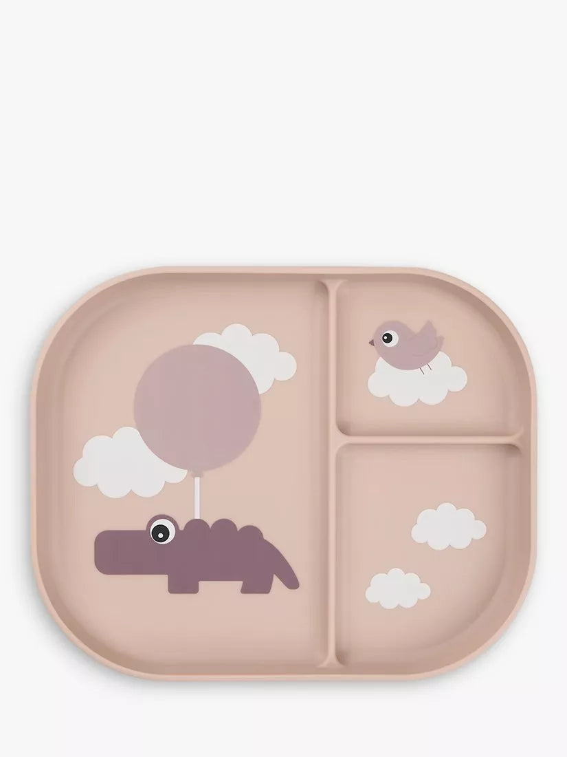 The compartment plate is printed with a playful Happy clouds motif. Croco and Birdee explore the world among the clouds and invite your child to experience new flavours and consistencies. The base's darker tone adds a two-coloured detail.