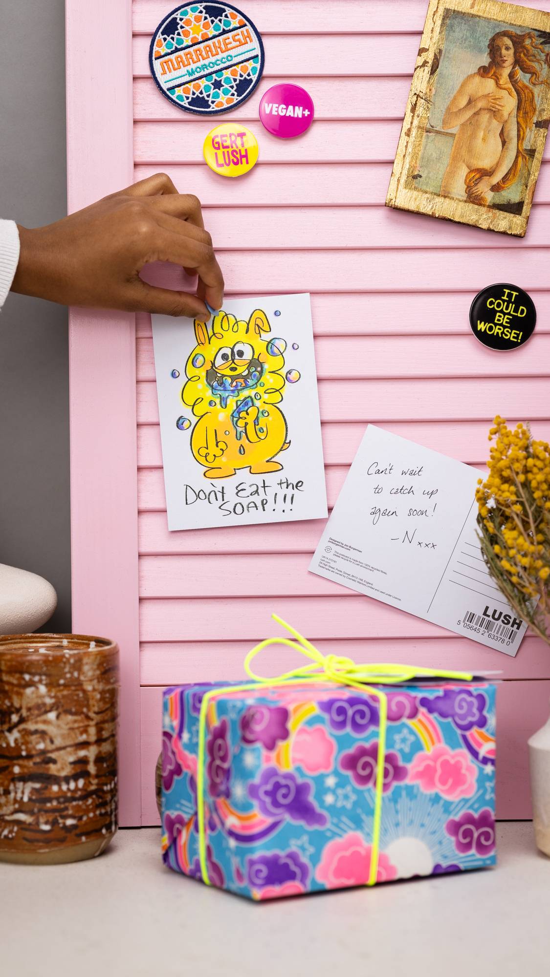 Showcasing a playful and irreverent design by British artist Job Burgerman and made from 100% recycled card (that can then be recycled again), this postcard is printed in Dorset on the south coast of England. Lush soaps certainly smell good enough to eat, but they're definitely only intended for making you smell delicious!