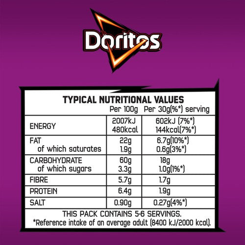 Experience the signature bold crunch of Doritos now intensified with Extra Flamin' Hot seasoning, offering a seriously spicy kick. These tortilla chips provide a substantial, flavourful snacking experience for intense moments. This 163g sharing bag is perfectly portioned for enjoying during group activities or when watching a film.