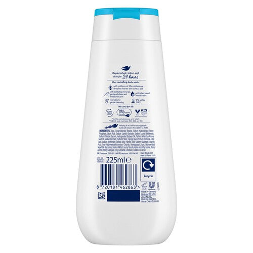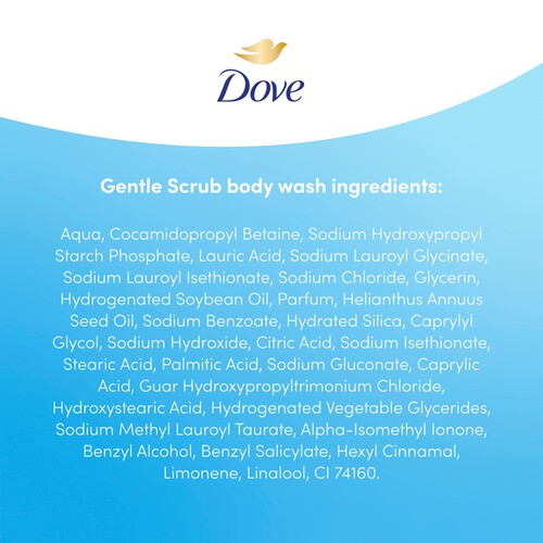 24-HOUR CARE, NOW FROM YOUR SHOWER: Dove Advanced Care Gentle Scrub Body Wash gently cleanses and deeply moisturizes the skin, leaving it replenished and lotion-soft for 24 hours., FEEL LOTION-SOFT ALL DAY: This nourishing formula is made with 24hrs Renewing MicroMoisture that leaves your skin replenished and lotion-soft all day., SHOWER YOUR SKIN AND DELIGHT YOUR SENSES: Made with sea minerals, this formula gently exfoliates and moisturises skin in just one shower., ULTRA-NOURISHING & GENTLE: With rich lather, this formula is made with naturally-derived cleansers, skin-natural nutrients and no sulfate SLES making it gentle to your skin and its microbiome., 24HRS RENEWING MICROMOISTURE: Infused with millions of moisturising microdroplets, tiny but powerful, that reach every inch to continuously renew skin's natural moisture and nourish deeply for 24hrs, DERM TESTED & MICROBIOME GENTLE: A mild formula that is dermatologically tested & approved. With plant-based moisturizers & Mild cleansers it gently cleanses your skin and nourishes its microbiome.