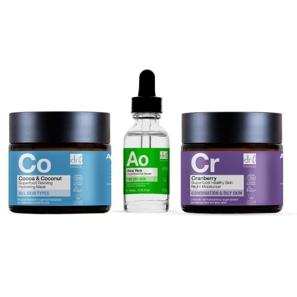 Read MoreImmerse yourself in the ultimate skincare experience with our luxurious kit, featuring a trifecta of next-generation, vegan products from our Apothecary range. The Cranberry Night Moisturizer, infused with natural ingredients, enhances your skin's tone and texture while locking in moisture for a soft, supple finish. As you slumber, this powerful formula brightens, reduces pores, and increases firmness, revealing refreshed skin upon waking. Awaken your senses with the Cocoa & Coconut Face Mask, a decadent treat that deeply nourishes and revitalizes your skin. This superfood powerhouse restores moisture, supports the skin's natural barrier, and boosts antioxidant levels in just 10 minutes, leaving your skin feeling luxuriously pampered. Finally, complete your skincare ritual with the Aloe Vera Superfood Eye Serum, a soothing and hydrating formula that improves skin texture and provides intense moisture. Enriched with Aloe Vera and Glycerin, this clean beauty product awakens your eyes with a plump, hydrated, and healthy appearance. This unparalleled skincare kit offers a complete solution for radiant, revitalized skin, leaving you feeling refreshed and confident.