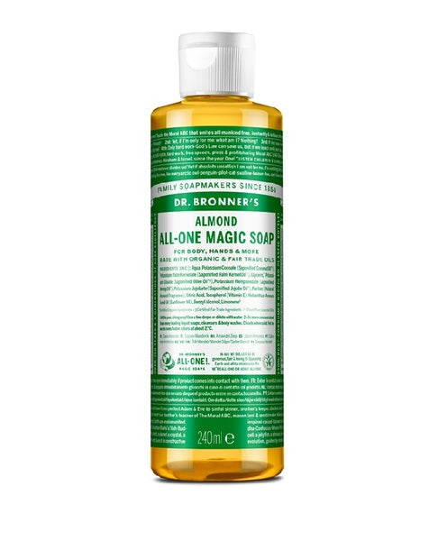 This Dr Bronner's All-In-One Magic Soap offers a warm, comforting almond fragrance profile that is slightly sweet, like marzipan or amaretto. It is certified organic and Fairtrade, demonstrating a commitment to high ethical sourcing standards. This versatile product functions effectively for numerous applications on the body and around the home as a true multipurpose soap.