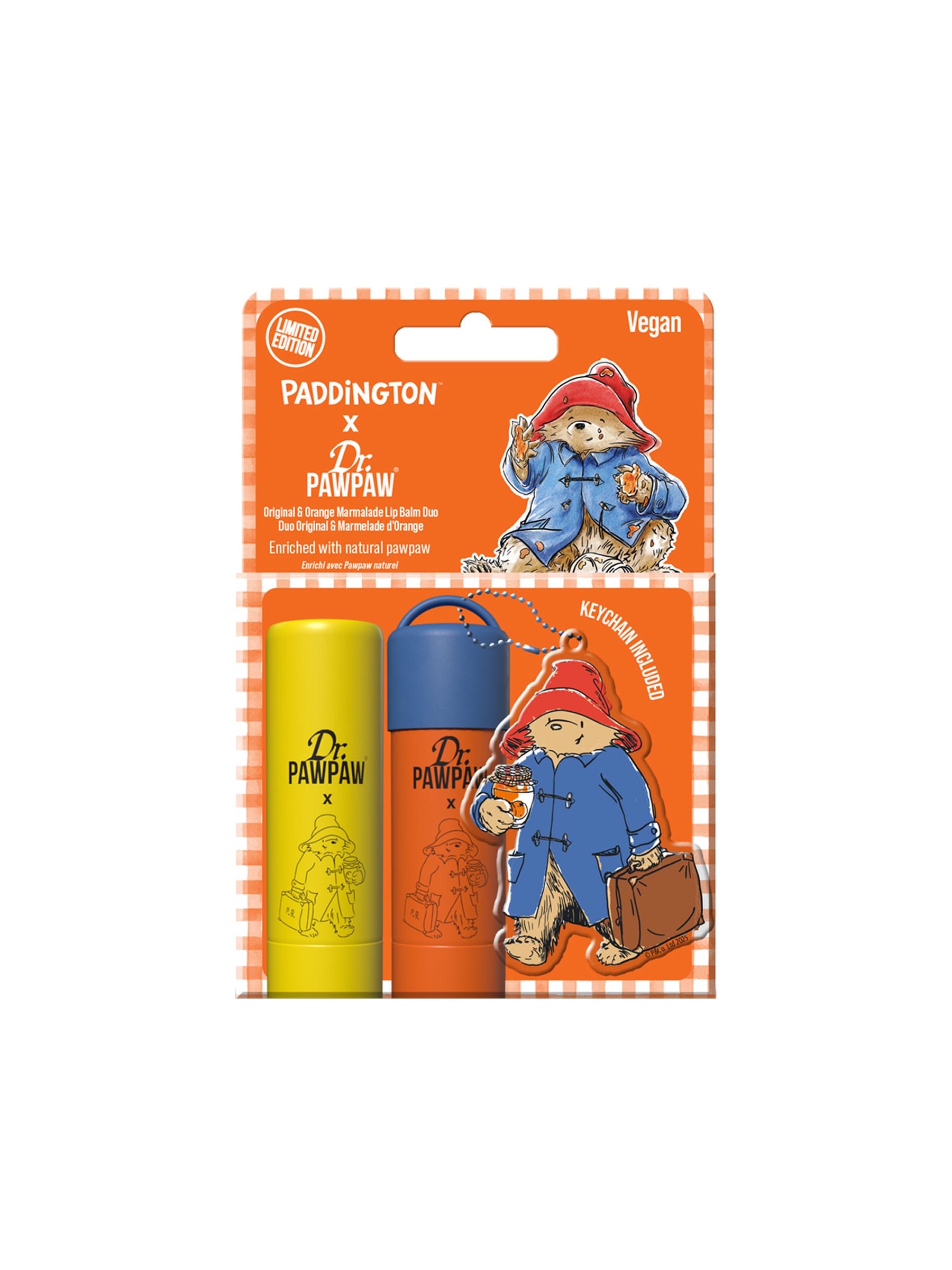 Dr.PAWPAW’s Paddington-inspired lip balm duo combines the multi-award-winning, 100% natural Original Balm in a stick with the delicious Orange Marmalade Lip Balm, the perfect duo for any adventure. Packed full of our hero ingredients, the PAWPAW fruit (papaya) loved for its deeply nourishing benefits, Aloe Vera to help soothe and comfort your pout, Castor Oil and Olive Oil chosen for their next-level moisturising powers. With the added keyring to take your Paddington lip balms wherever your next adventure takes you. Please look after these lip balms. Thank you.
