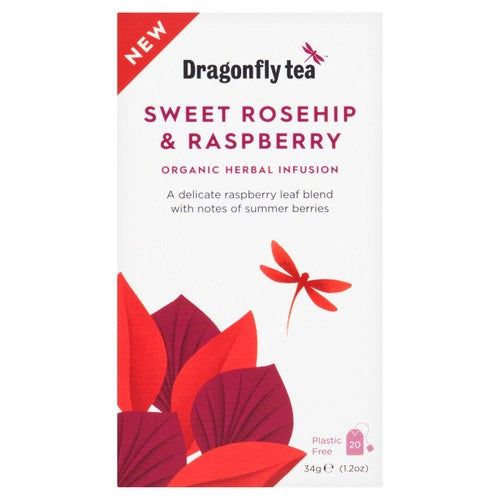 Enjoy Dragonfly's comforting and supportive Sweet Rosehip & Raspberry Organic Herbal Infusion. This blend balances raspberry leaf with delicate hints of rosehip, apple, and sweet summer berries. It results in a light, caffeine-free cup brimming with natural poise.