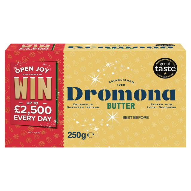 Dromona Butter 250g is a Great Taste 2024 award winner, celebrated for its rich flavour and smooth consistency. Churned locally in Northern Ireland, this product brings local goodness to your table. It is specifically noted for being very creamy and perfectly spreadable for daily use.