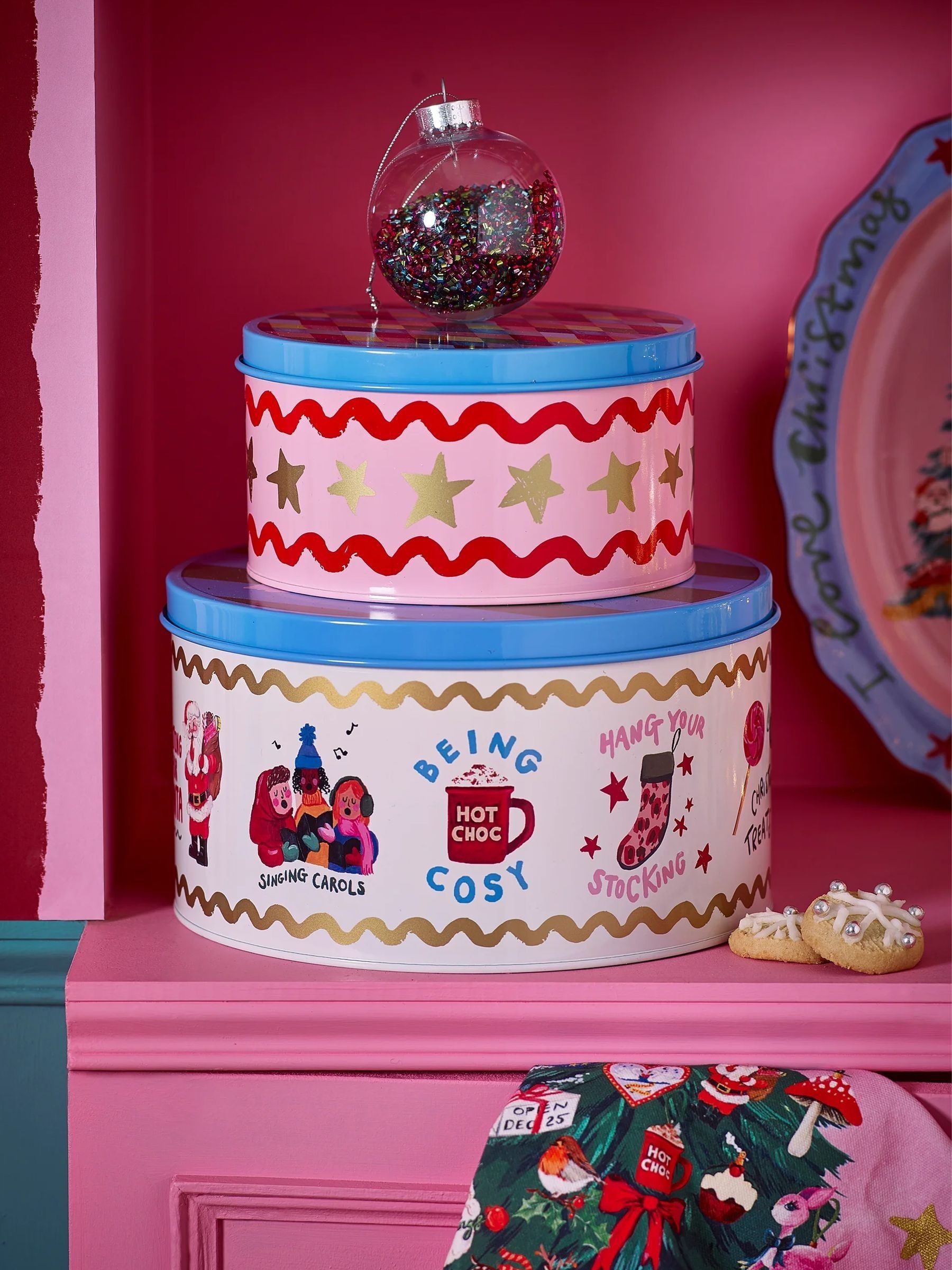 Keep your festive bakes fresh and stylishly stored with the Eleanor Bowmer Fabulously Festive Set of 2 Cake Tins. This charming duo includes a larger tin decorated with a playful array of Christmas illustrations and phrases like "Being Cosy" and "Hang Your Stocking," all framed by a gold scalloped edge. The smaller pink tin features a delightful star pattern, with a vibrant multicoloured harlequin lid. Perfect for gifting your homemade treats or simply keeping them delicious for longer. Size : ONE.