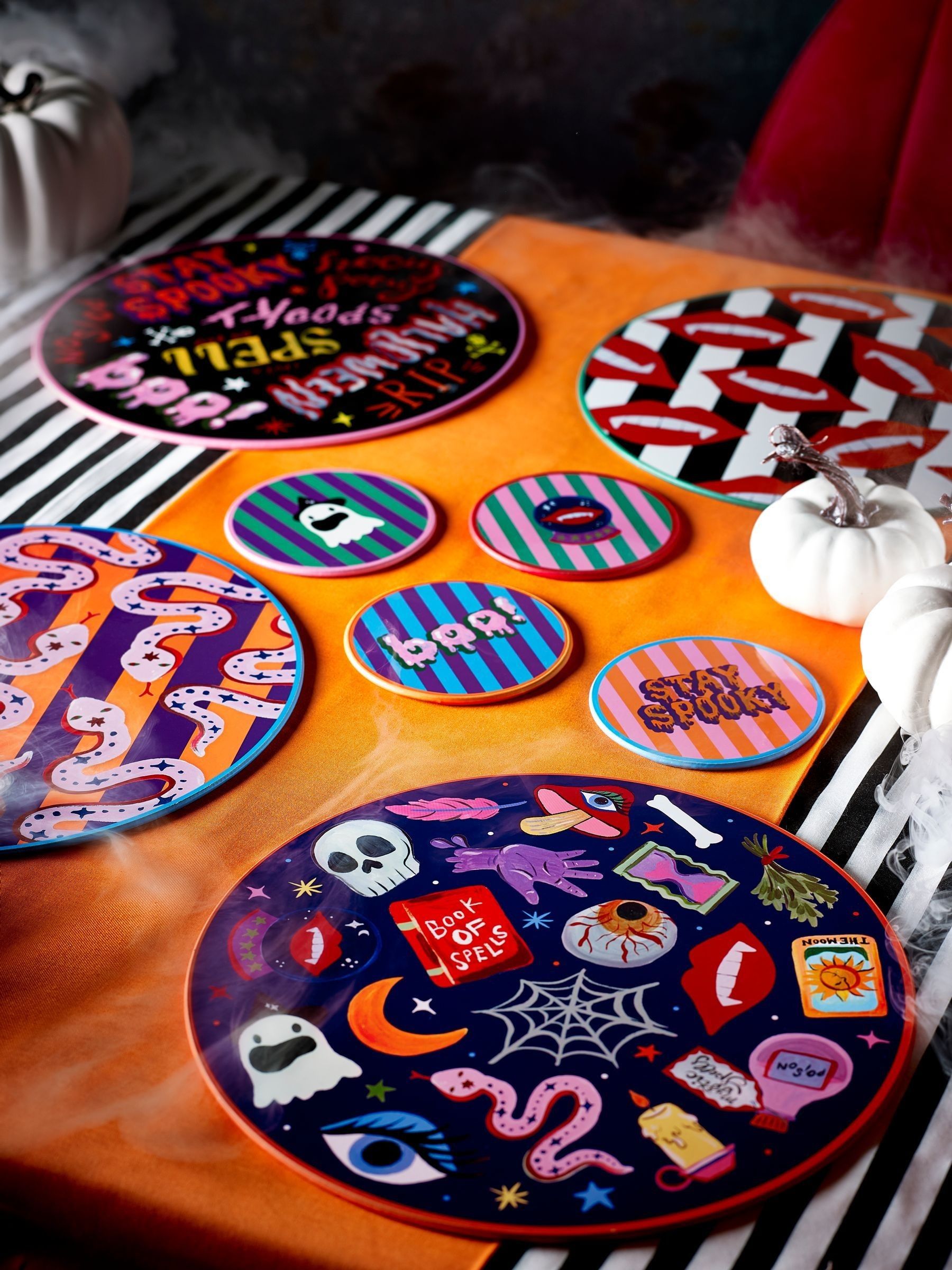 Set the (spooky) table in style with this Eleanor Bowmer Halloween placemat and coaster set! Featuring 4 placemats and 4 coasters, each piece is adorned with Eleanor’s signature hand-illustrated designs — think quirky ghosts, slithering snakes, bold skulls, and fun Halloween slogans like ‘Stay Spooky’. Whether you’re hosting a haunted... Read More