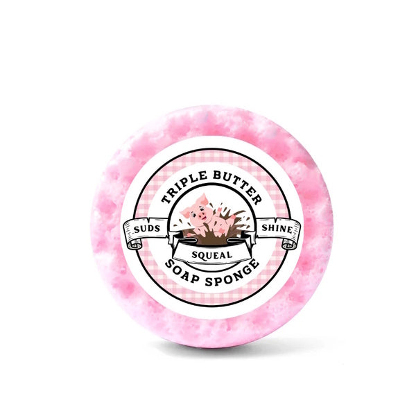 The Raspberry Lemonade Soap Sponge features a mouth-watering scent of tangy lemonade and juicy raspberries, with a cute pig-in-mud graphic and a nourishing triple butter formula.