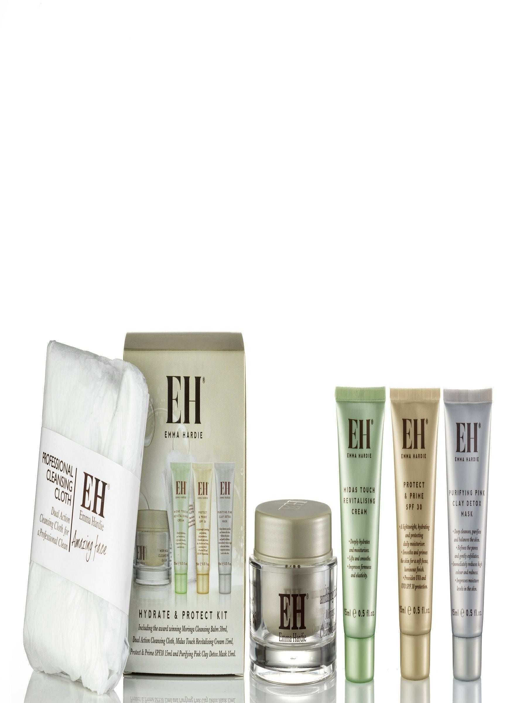 Dermatologically tested, clinically tested, clinically proven, suitable for sensitive skin.Contains... 50ml Moringa Balm Cleansing Cloth15ml Midas Touch Cream15ml Protect & Prime SPF3015ml Purifying Pink Clay Detox Mask.