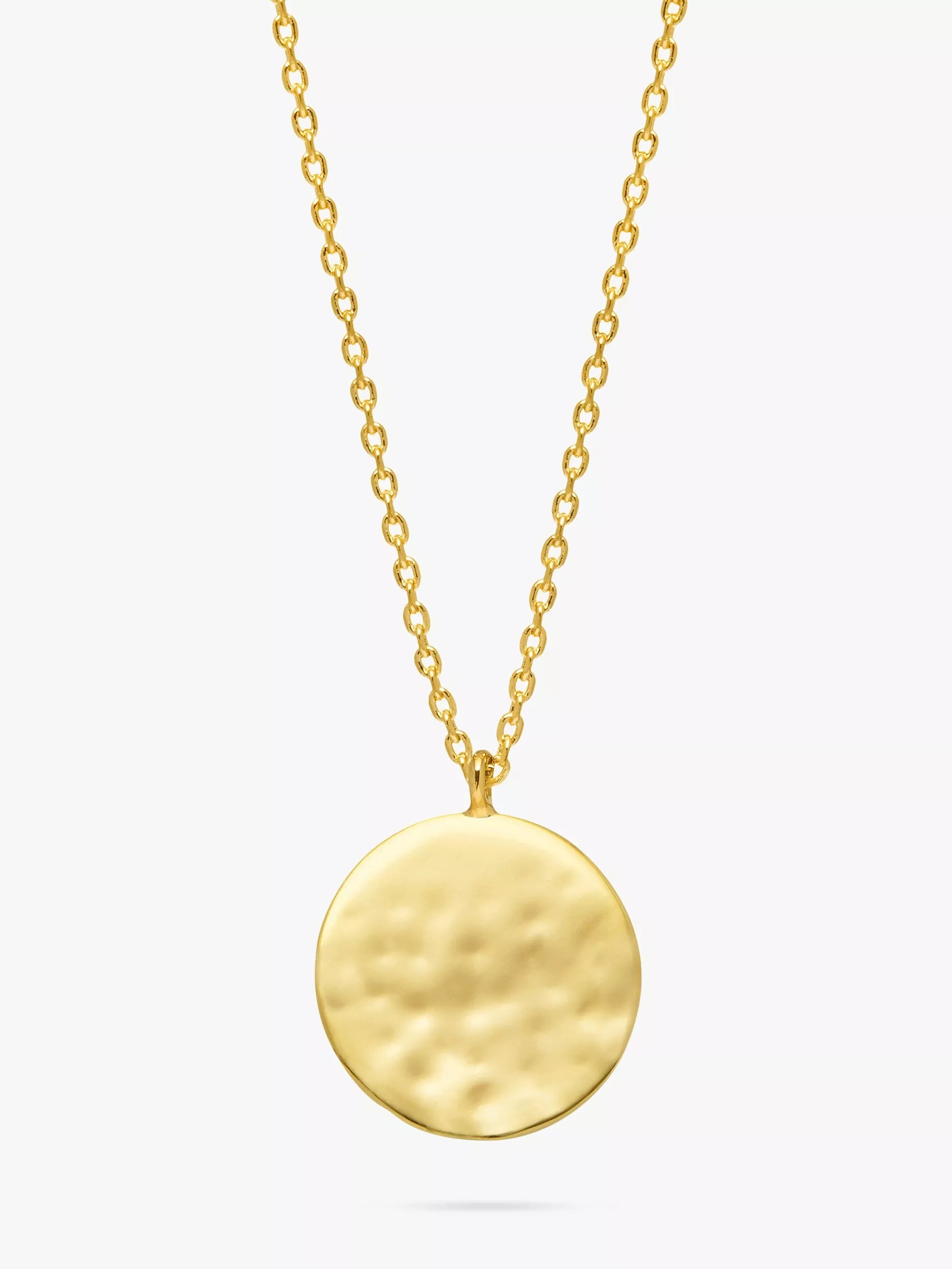 The necklace catches the eye with its hammered disc, the finish creating subtle light reflections. The pendant is suspended from an adjustable chain.
