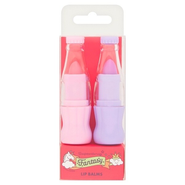 This set provides two lip balms packaged creatively as milk bottles. The duo includes two distinct shades, Pink and Purple, for varied cosmetic use. Both formulations contain Paraffinum Liquidum and Tocopheryl Acetate to condition the lips.