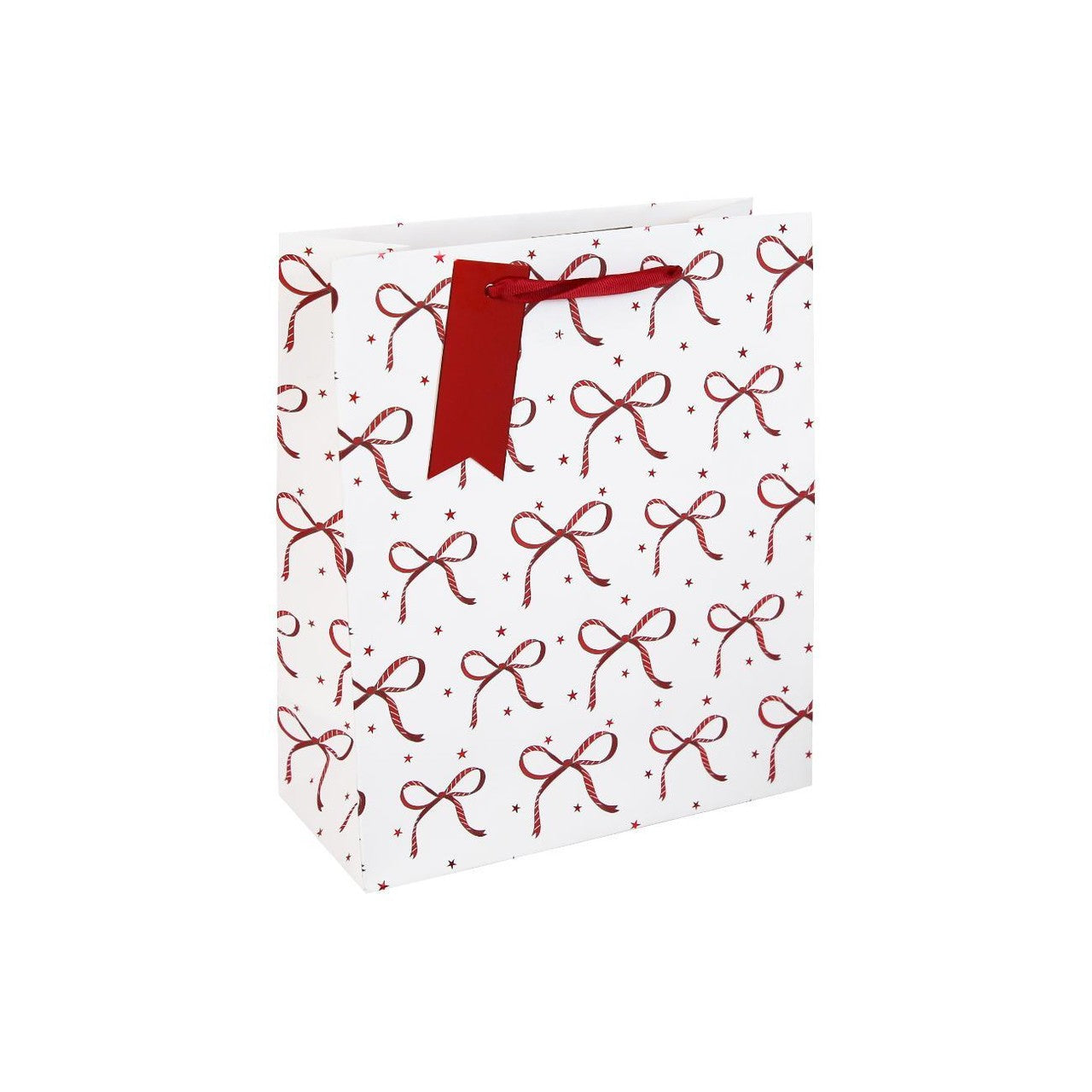 This medium-sized gift bag provides an elegant way to present festive gifts this season. Crafted from white kraft material, it features a detailed all-over bow print for visual appeal. The design is elevated with premium details that enhance its suitability for holiday occasions.