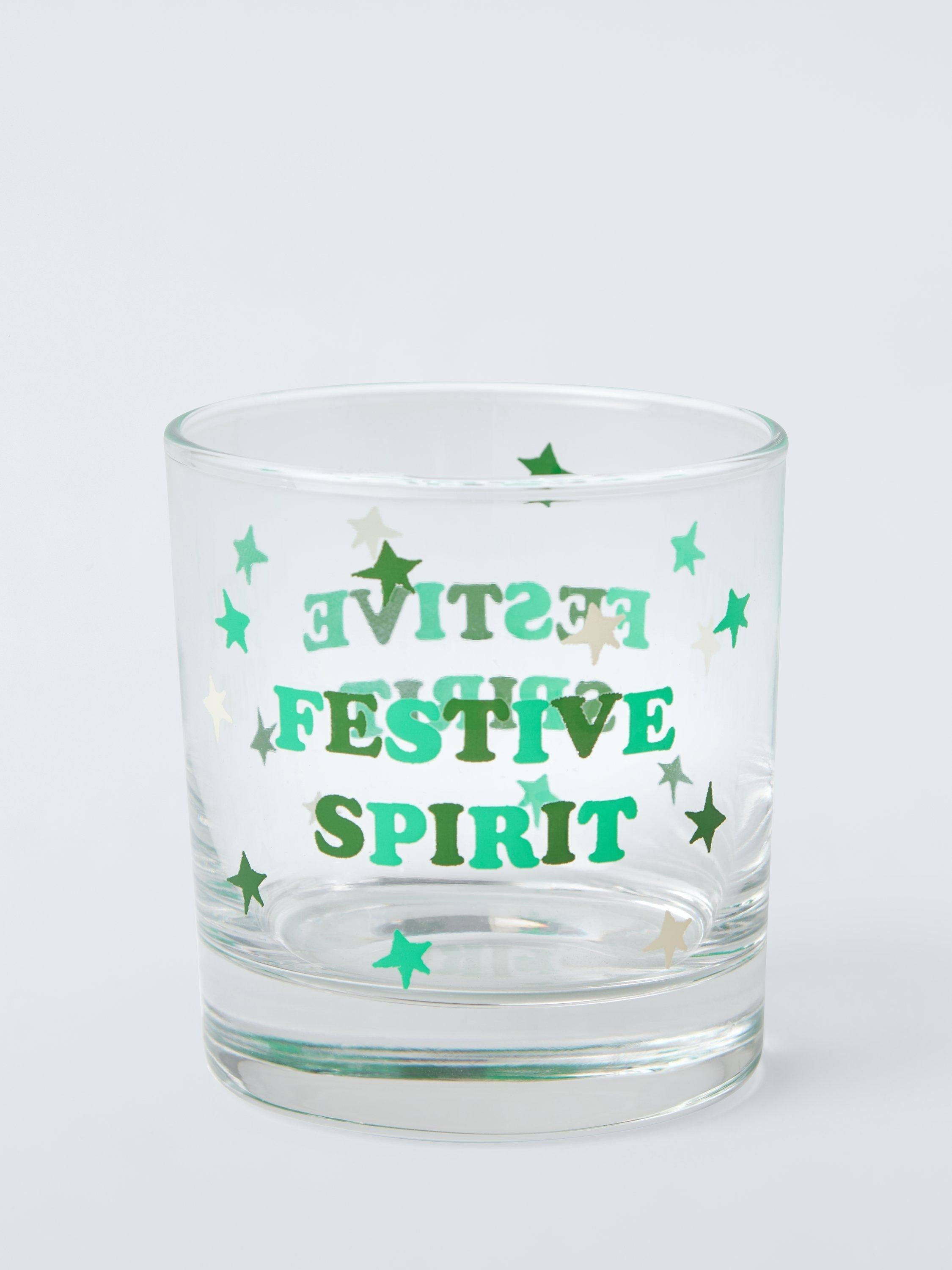 Read MoreGlass tumbler with a screen-printed 'Festive Spirit' slogan and Christmas stars design.