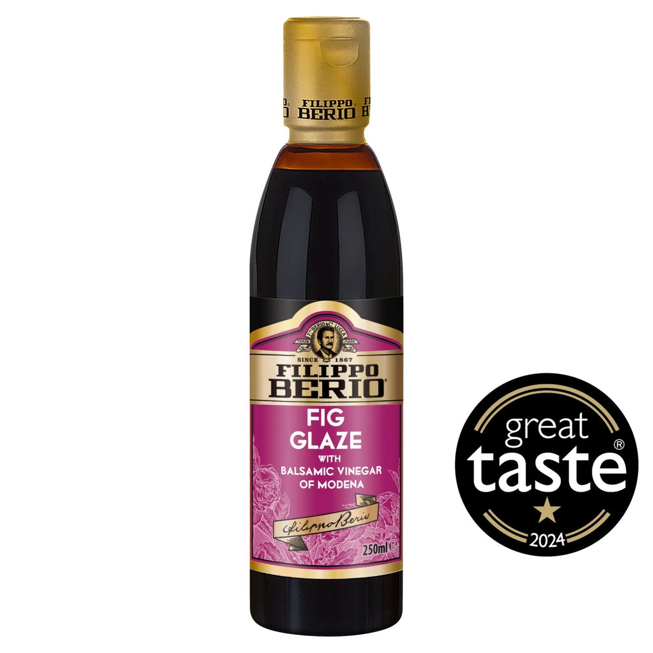 Filippo Berio Fig Glaze is presented as an artistic garnish, offering a thick syrup consistency. This condiment is rich and deeply infused with the natural, sweet taste of figs, elevating everyday meals instantly.