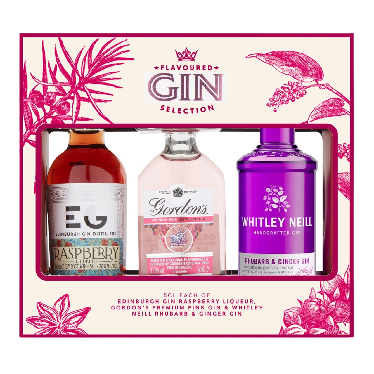This selection features a convenient trio of 5cl bottles showcasing distinct flavoured gins and liqueurs ideal for sampling or presenting as a small gift. You receive a balanced selection combining fruity, spicy, and subtly sweet profiles for varied tasting experiences. These miniature spirits allow you to explore premium flavours instantly.
