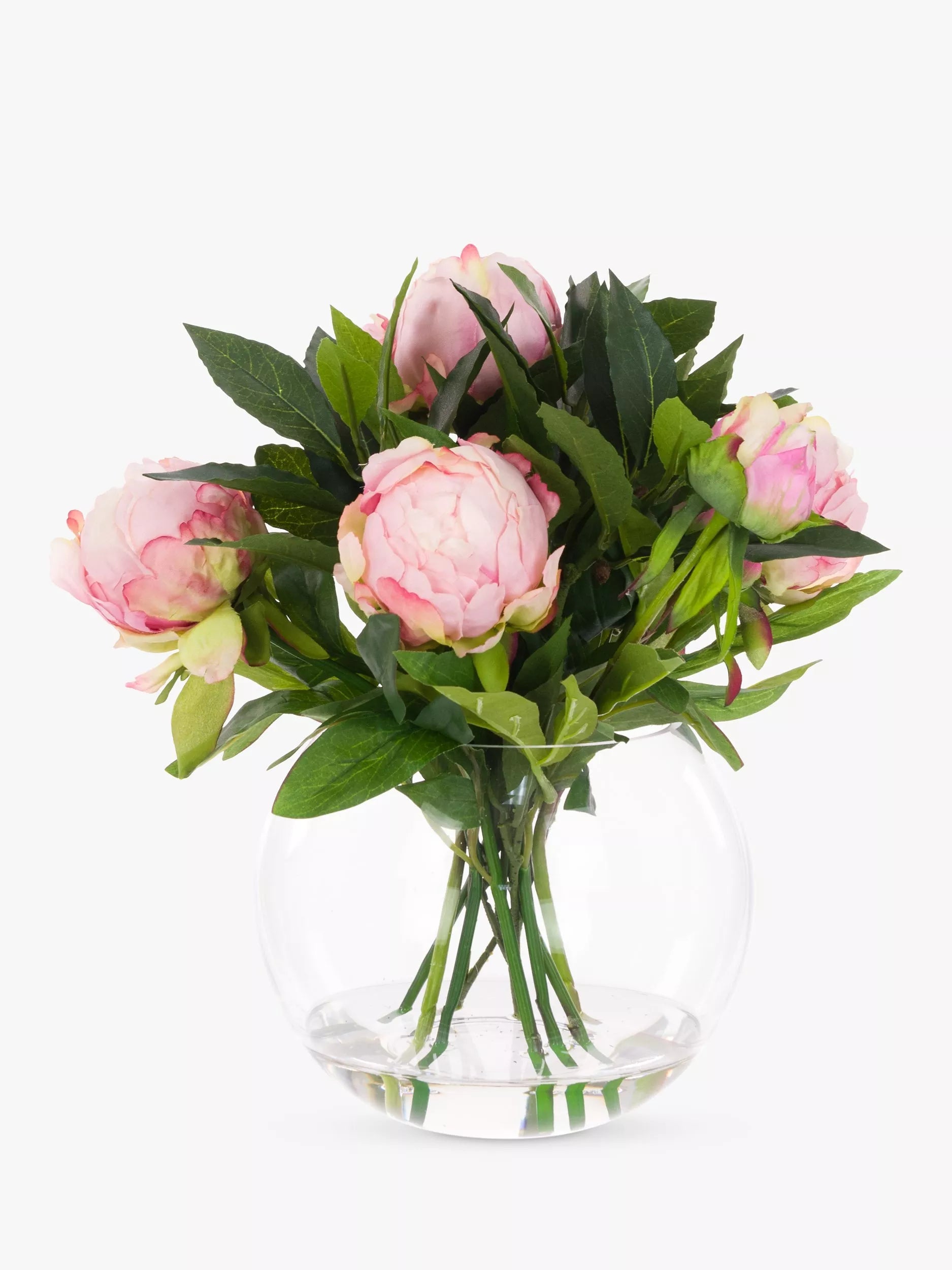 Delightful pink peonies contrast beautifully against an abundance of sweet bay leaves in this faux floral arrangement. Stunningly realistic in their detail, these flowers will remain in bloom all year round.