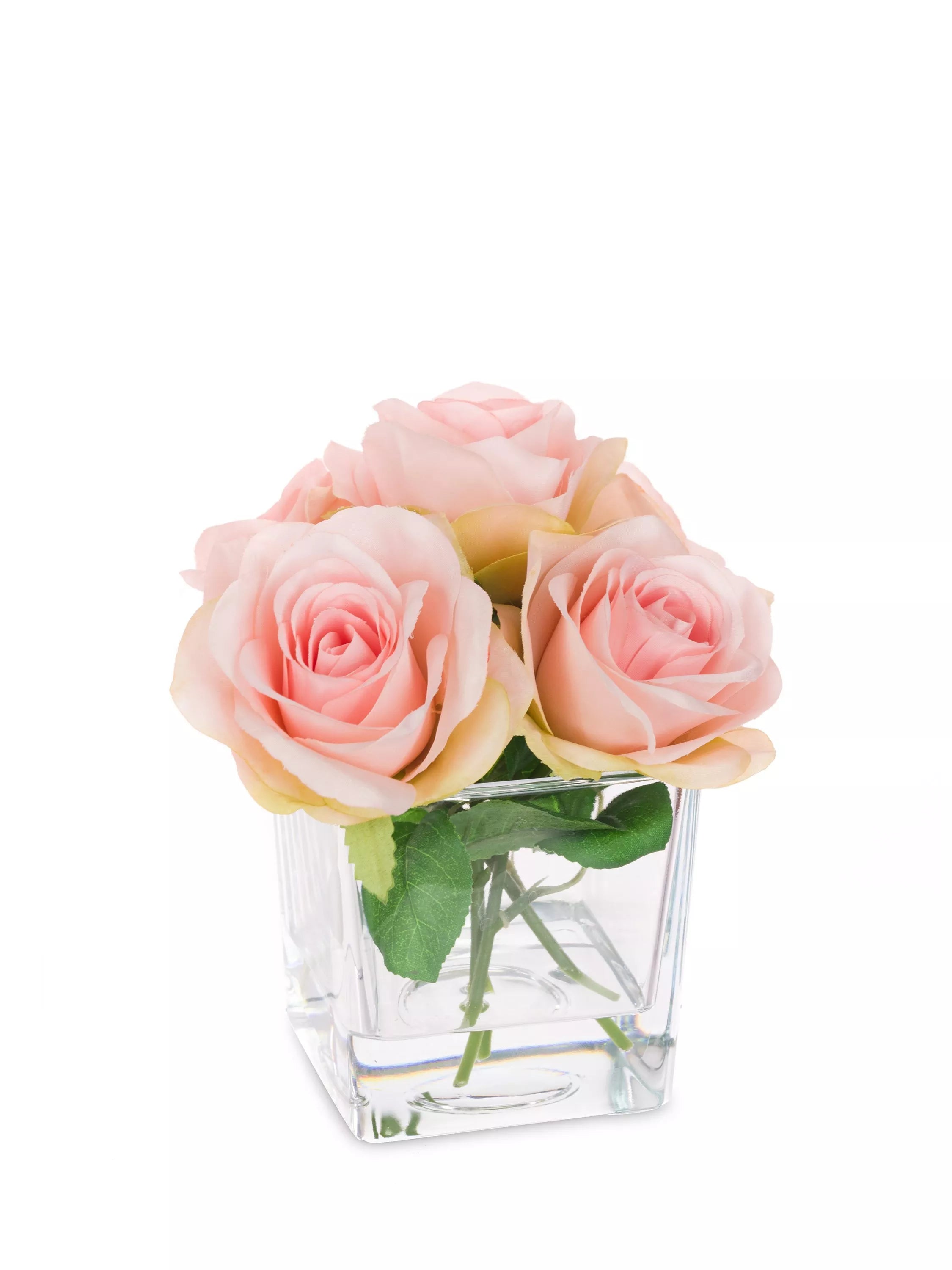 Enjoy the timeless beauty of roses without the upkeep! This stunning artificial rose arrangement in a cube vase adds a touch of elegance to any space.