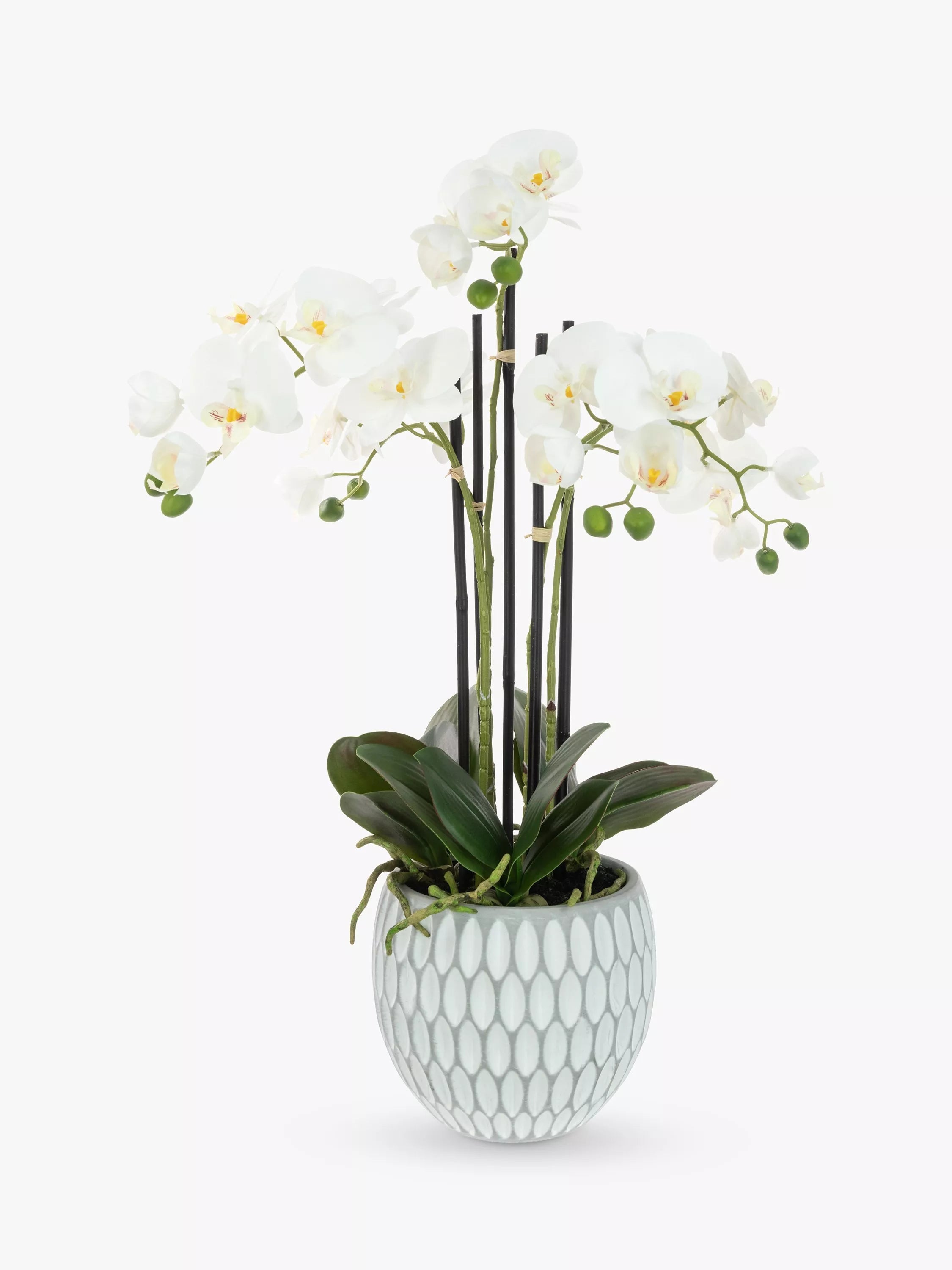 Add a touch of elegant sophistication to your home with this stunning artificial white orchid, artfully arranged in a geometric pot. This low-maintenance alternative to fresh flowers offers lasting beauty and style. It's the perfect decorative accent for any room.