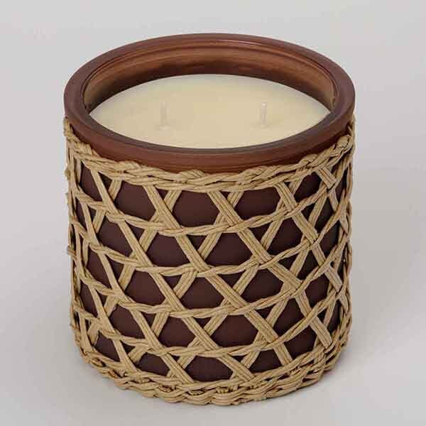 the brown ceramic container with woven outer detail holds a beautiful black cherry cedarwood scented candle to not only make a statement in your home but to fill your home with a stunning aroma to make your guests envious 2wicks scented candle large size material above 51 shea butter wax fragrance percentage 10 wax weight 425g 1 candle per pack w bamboo weaving
