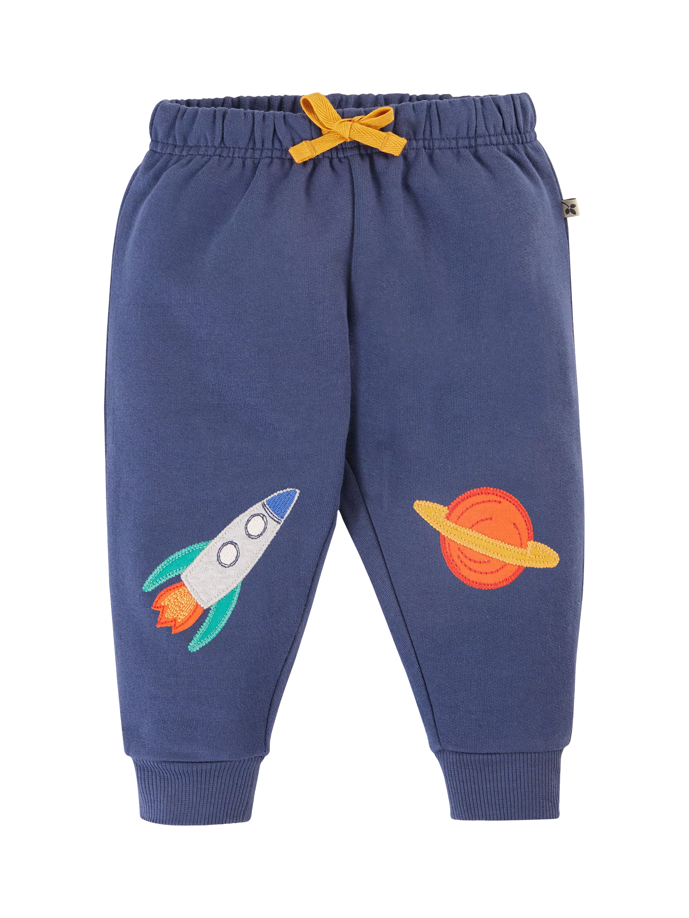Super-soft and cosy joggers, crafted from organic cotton with an elasticated waistband and drawcord, stretch rib cuffs and a rocket and planet patch on the knees for a playful finish.