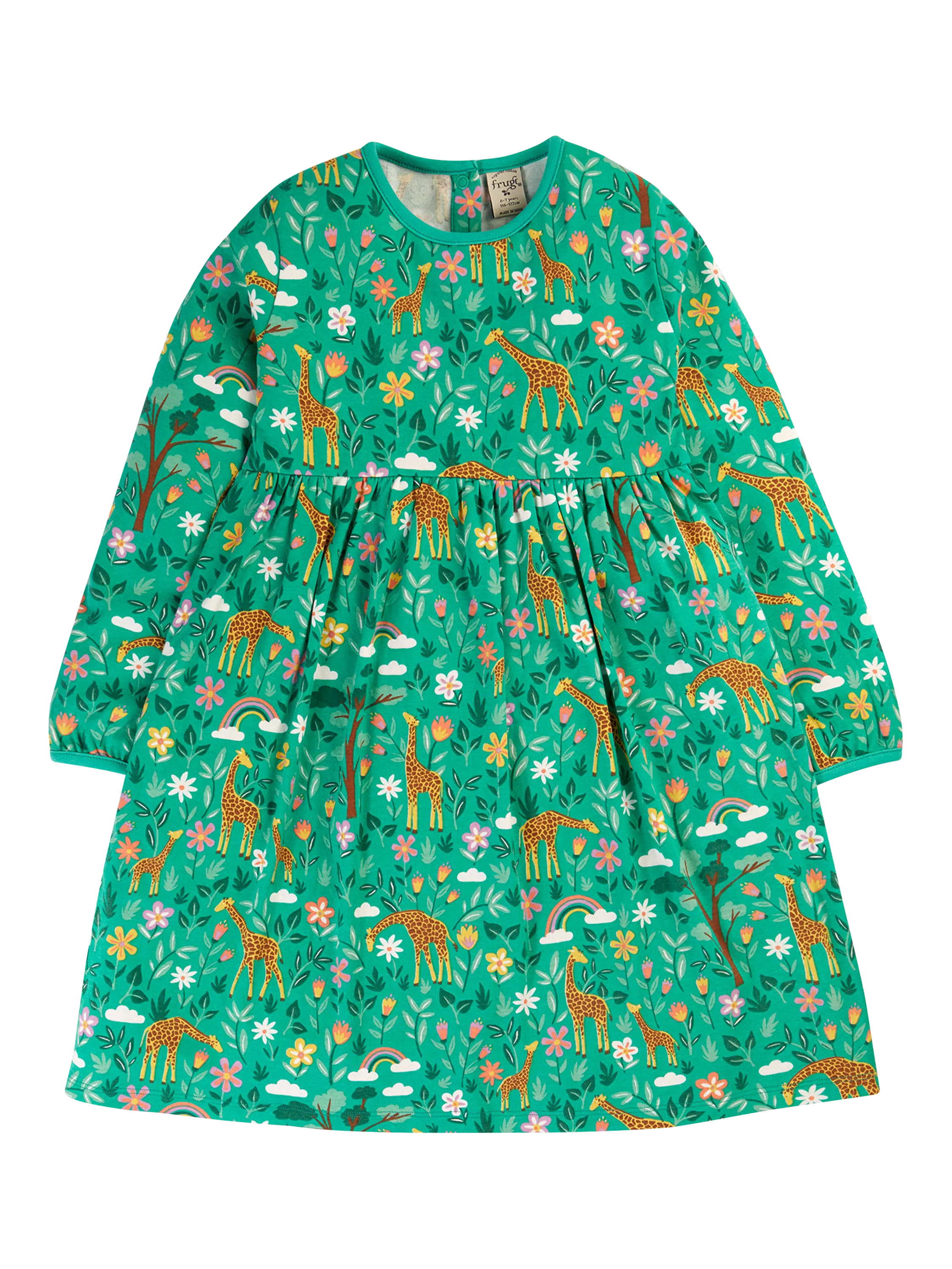 Dress your little one in adorable style with the Frugi Kids' Dani Organic Cotton Giraffe Dress! This charming knee-length dress is perfect for everyday wear and special occasions alike, offering comfort and sustainability.