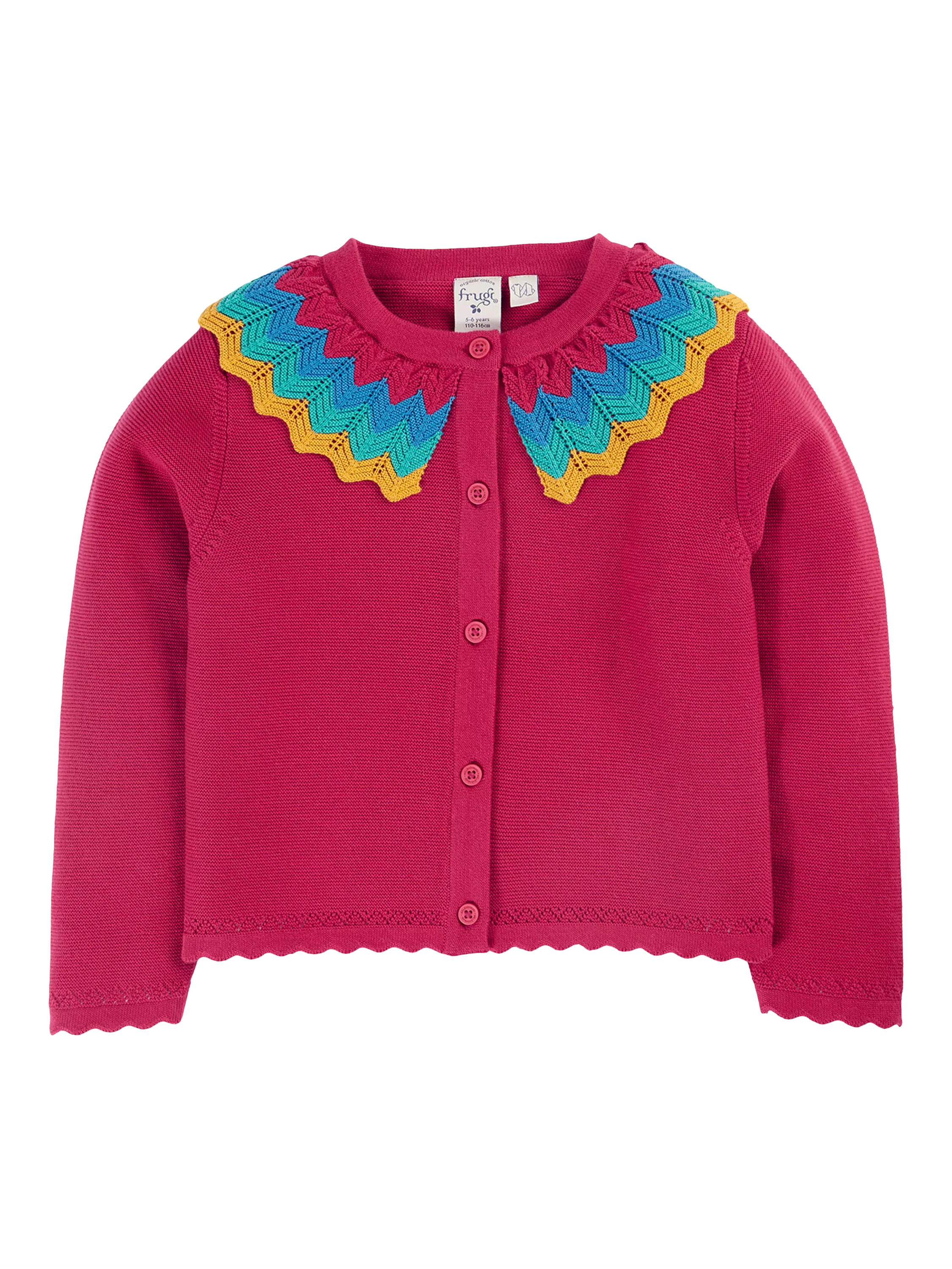 An organic cotton knitted cardigan with an intricate collar detail and scalloped cuffs and hemline.