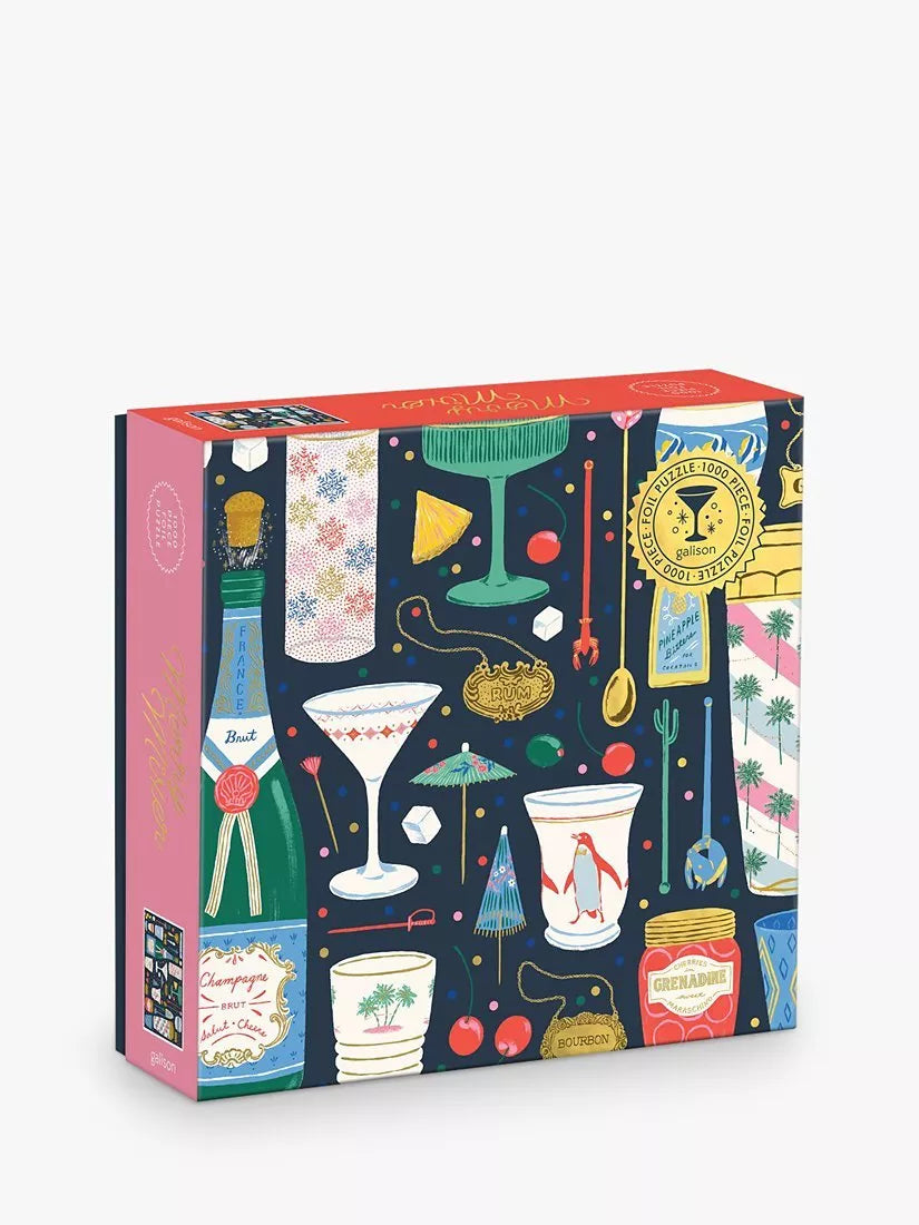 The Merry Mixer 1000 Piece Puzzle by Galison is a medley of merry and festive barware all dressed for the holidays. This puzzle is just the right level of challenge for the whole family to join in on for hours of puzzling fun! The box includes an insert with the full puzzle image for reference. This puzzle features a charming collage of colourful cocktails and drinks with gold accented foil. Puzzle lovers will appreciate all the delightful details as they piece together the puzzle, creating a beautiful display that will add a touch of charm and holiday elegance to any room.