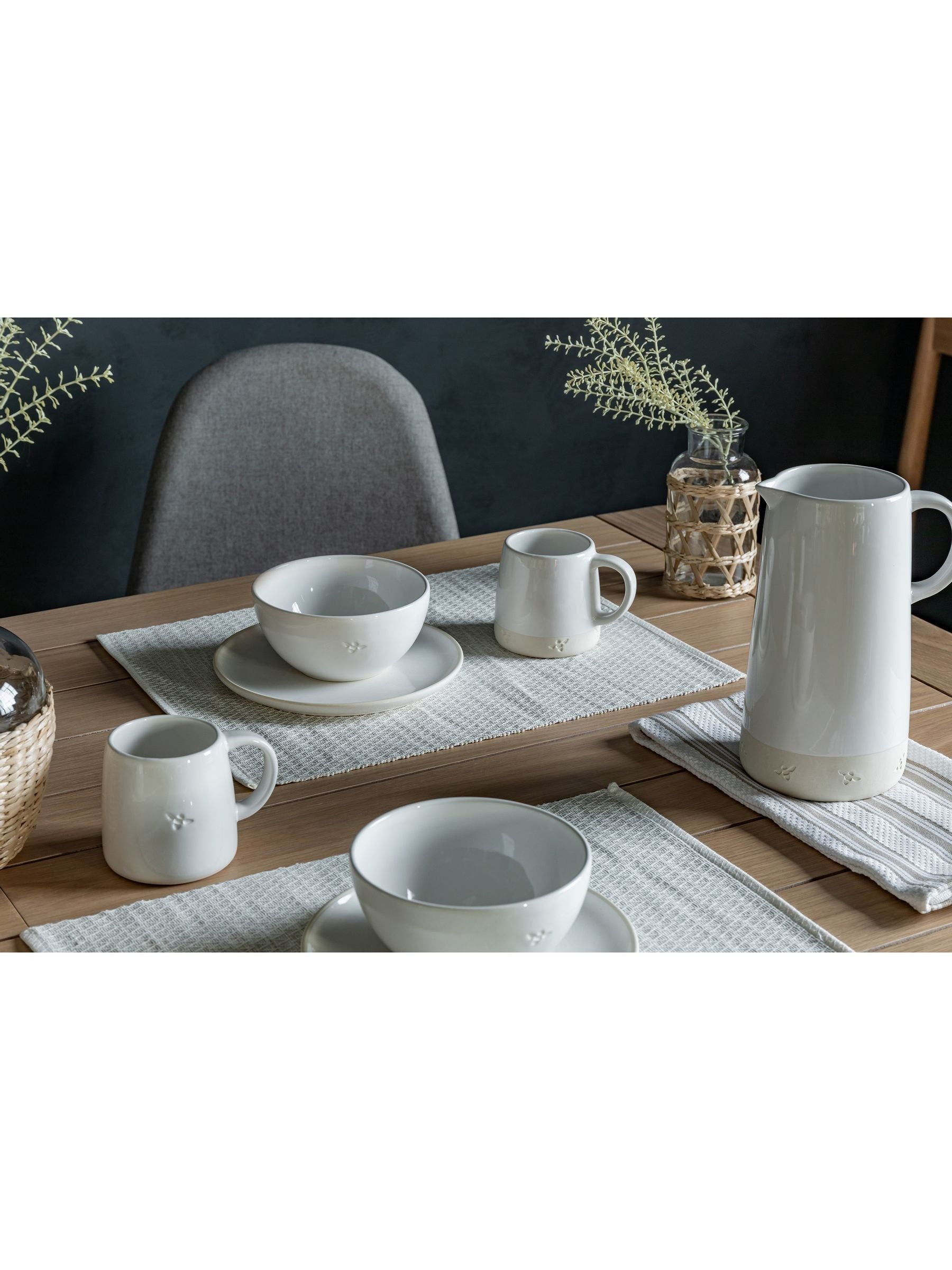 Set of 4 mugs designed to add some rustic cosiness to your kitchen. With a two tone white and natural ceramic glaze, the mugs feature a subtle and delicate bee design. Coordinating bowls, plates and a jug available.