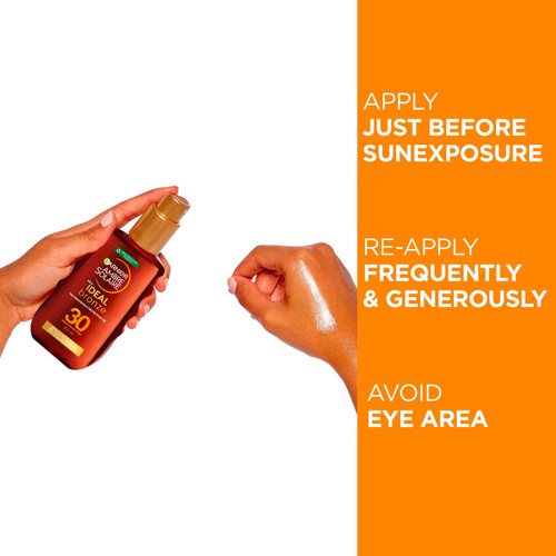 Garnier Ambre Solaire IDEAL BRONZE SPF30 is a sun protection oil designed to shield your skin while promoting a better colour. This advanced formula is enriched with nourishing Shea butter, which leaves a soft, satin touch on the skin’s surface.