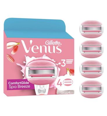 Achieve a closer, smoother shave with Gillette Venus ComfortGlide Spa Breeze razor blade refills. These blades feature built-in gel bars that lather and shave in a single motion for convenience. The SkinCushion technology helps guard your skin against common shave irritation, providing comfort throughout your routine.