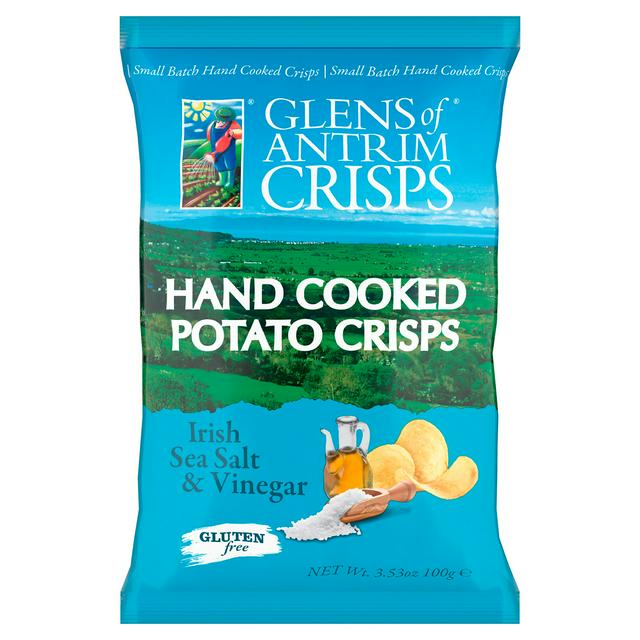 Product details Description Potato Crisps with Irish Sea Salt & Vinegar flavour. Gluten free Small batch hand cooked crisps GMO free No artificial colours or artificial flavours Vegetarian friendly The Glens of Antrim are full of myth and legend, this is where we make the perfect crisp. On the side... Read More