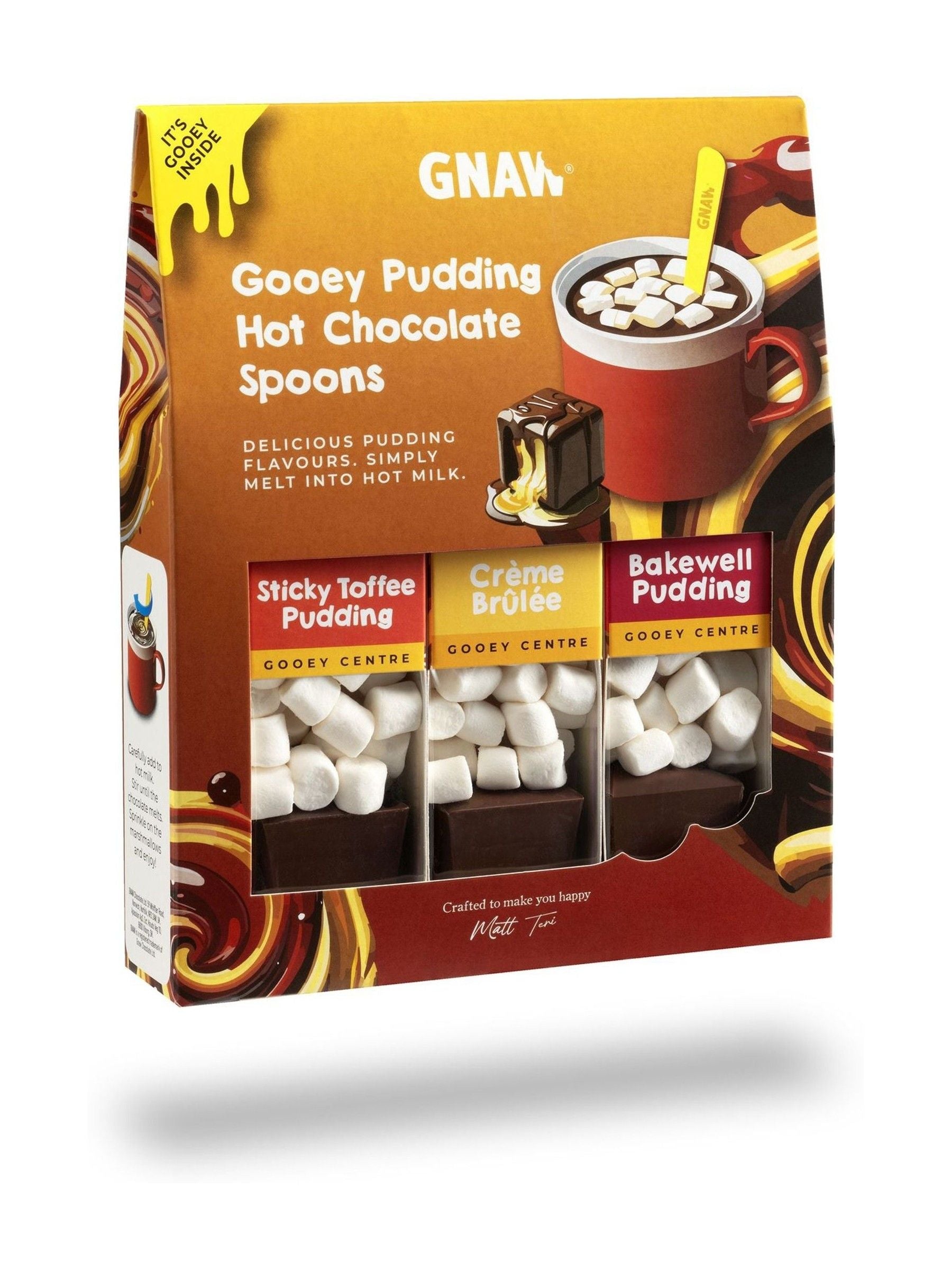 Dive into dessert heaven with our Gooey Pudding Hot Chocolate Spoon Gift Set! Three glorious flavours to stir into your mug: the nostalgia of Bakewell Tart, the silky smoothness of Crème Brûlée, and the rich delight of Sticky Toffee Pudding. These hot chocolate spoons are like scooping a spoon of your favourite pudding straight into hot, steamy milk! Perfect for cosy nights in or even better, a delicious gift for someone who needs a good hot chocolate in their life. UK Mainland Delivery Only.