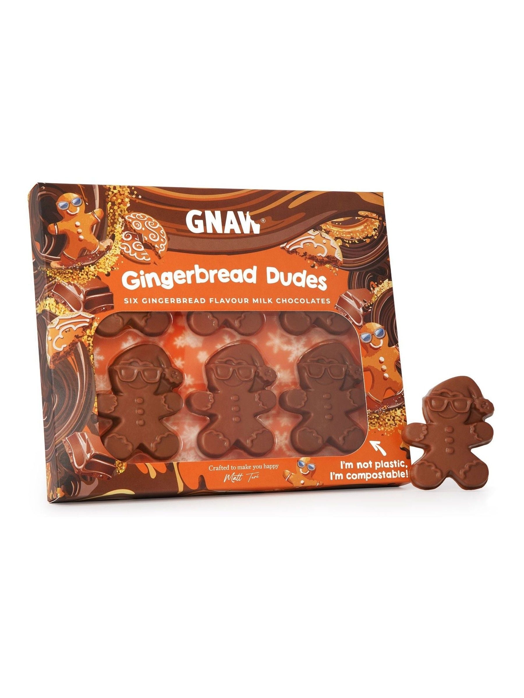 These dudes are made from high-cocoa 40% milk chocolate and have a merry gingerbread kick for that melt-in-the-mouth Christmas flavour. Add some yum-a-licious to your Christmas with these gingerbread dudes. Each cheeky dude is made from rich Colombian milk chocolate and infused with festive gingerbread spices. Whether you scoff one with a hot drink by the fire, scatter them across the dessert table, or stick them into stockings for a chocolatey surprise – these guys are sure to make Christmas that bit more special. Made with GNAW’s signature milk chocolate blend, these fun-sized figures are as cute as they are tasty. Perfect for gifting, sharing… or secretly keeping for yourself… we won’t tell! UK Mainland Delivery Only.